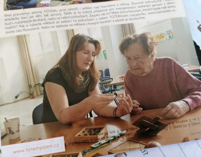 Pracujeme převážně se seniory a ti se mnohdy hlavolamů bojí. Často slyším: „To mi nikdy nešlo.“ A proto u seniorů pracuji jinak. Využívám příběhy, ať už příběhy o tom, jak v naší rodině hlavolamy vždy byly, nebo vyprávím, jak jsem ke kterému hlavolamu přišla. Nosím jim retro hlavolamy a společně vzpomínáme na to, jak podobné nebo stejné měly doma jejich děti.