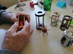 I pokud již senior nedokáže hlavolam rozebrat, pracujeme se zvuky, tvary, barvami přes hmat, sluch, zrak.