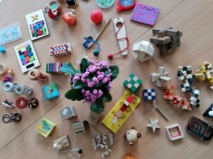 - Hlavolamy zkoumejte, dívejte se na barvy, tvary, strukturu, poslouchejte zvuky.