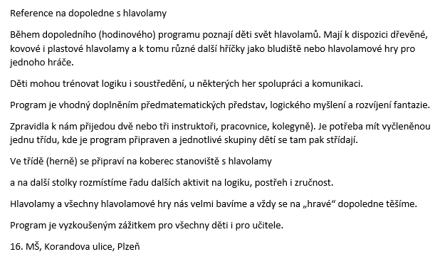 - pokud chcete hlavolamy využít jako aktivitu na odpoledne do družiny, platí podobné informace, jako jsem psala výšu u školky. Je možné domluvit prolínání skupin s tím, že první přijdou děti, které mají odpolední kroužky, jdou po obědě, jede jim autobus apod.,
