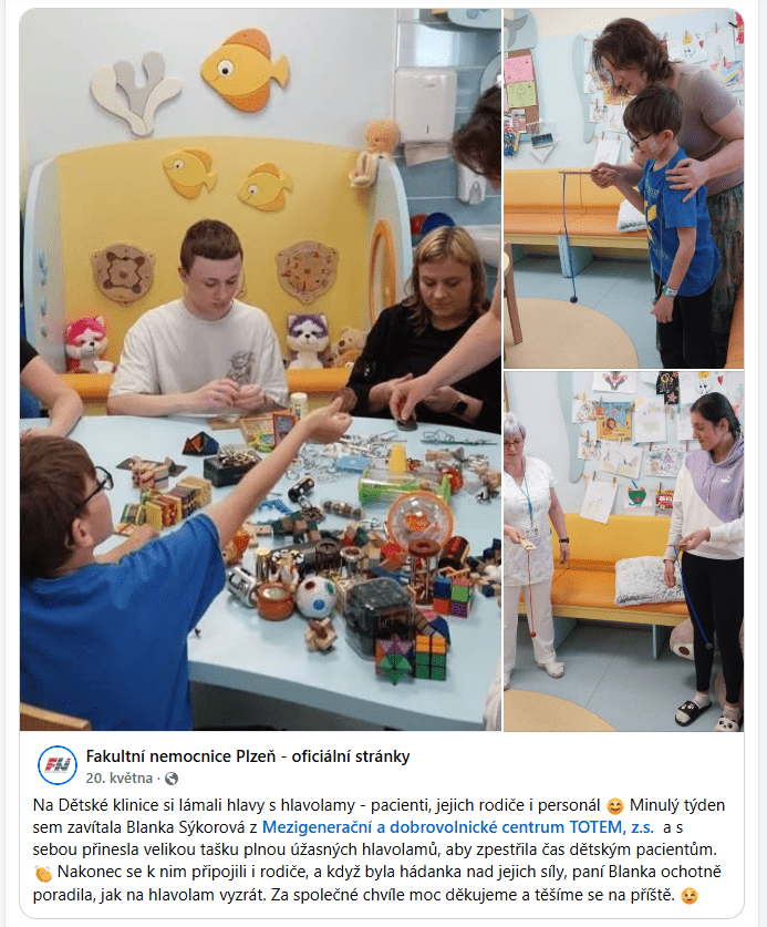 V domově pro seniory jsem byla půl roku jako dobrovolník, několikrát jsem byla jako dobrovolník v nemocnici na LDN. A tohle jsou místa, kam by hlavolamy opravdu zařadila.