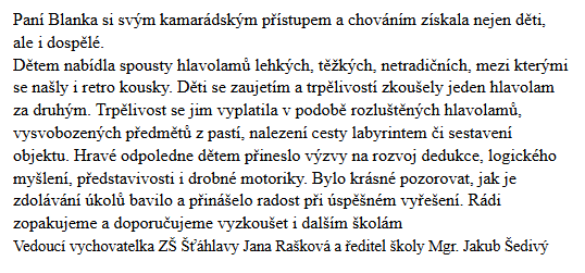 - vítám, pokud se zapojí i paní učitelky, ale ne jako pomocníci (výjimka viz. níže), ale jako účastníci. Je velmi přínosné, pokud děti vidí, že i paní učitelka musí nad něčím přemýšlet, a třeba jí to moc nejde, zároveň si paní učitelka aktivitu vyzkouší a třeba v sobě objeví nadšení pro hlavolamy.