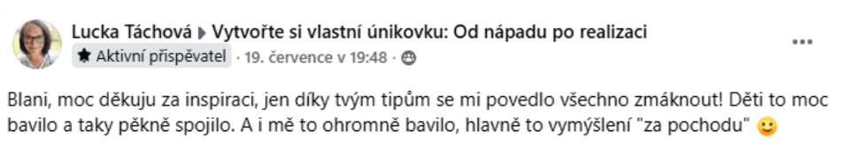 Při zakoupení kurzu Vytvořte si vlastní únikovku do 31. 8. 2025, získáte 6 měsíců podpory v doprovodné skupině na Facebooku. Počítáno od vstupu do skupiny.