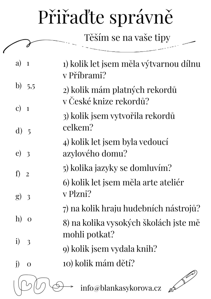 Připravila jsem kvíz, kam jsem dala pár čísel z mého života. Pokud je dobře přiřadíte, prodloužíte si členství ve skupině. Své odpovědi mi napište na e-mail info@blankasykorova.cz a do předmětu napište velkým písmem [SOUTĚŽÍM] nebo použijte tlačítko níže.
